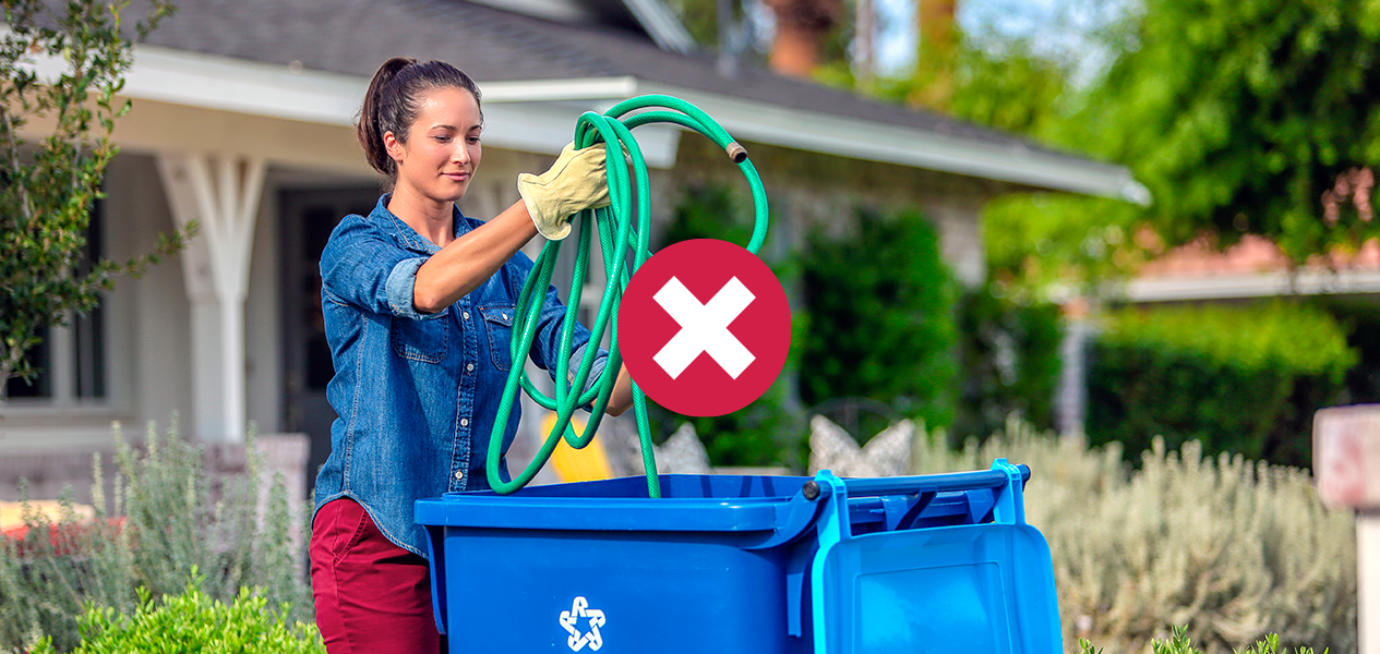 Common items that wrongfully end up in recycling centers include: bowling balls, clothes, shoes, garden hoses, propane tanks, footballs, golf balls and basketballs.